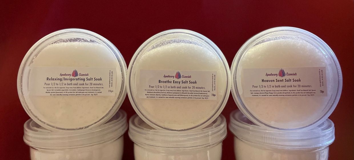 Ingredients: Dead Sea Mineral Salt fine/ultra fine blend, Melaleuca alternifolia (TeaTree), Melaleuca quinquenervia (Niaouli), Boswellia Serrata (Frankincense), Myrtus communis (Myrtle), Gaultheria procumbens (Wintergreen) and Abies balsamea (Fir Balsam)